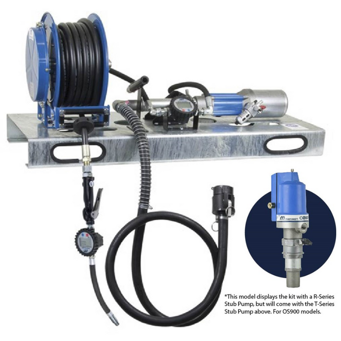 DESCRIPTION: Using the OILMASTER pump this kit is designed to be top-mounted on IBC's and is capable of handling a wide range of viscosities. TECHNICAL SPECIFICATIONS: Solid hot-drip galvanised base frame | T512-01 air-operated oil pump | Heavy-duty, twin-pedestal oil reel - 15m x 1/2" hose | HG20F-012E-01 metered oil control gun & holster | All connecting fittings, hoses, breather and couplers