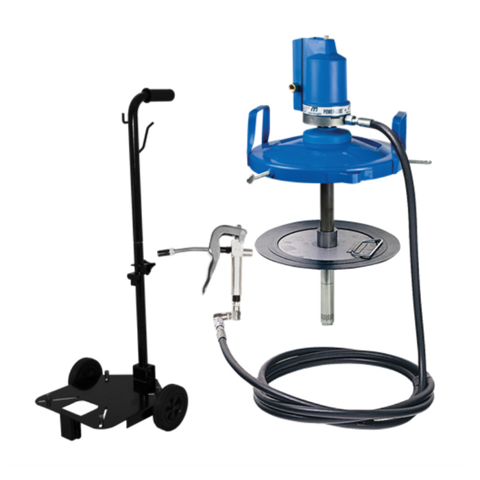 DESCRIPTION: The POWERLUBEâ„¢ is a premium quality, reliable, 50:1 air-operated pneumatic greasing system that is excellent for high volume grease users that have many applications and require continuous high pressure greasing. This portable grease dispensing system is suitable for 20kg pails and is equipped with a low air consumption motor that doesn't need to be lubricated due to the use of modern polymer materials. Users will save on power and the oily mist and mess associated with air operated equipment is gone. Suitable for underground coal mine applications. Comes with trolley. PACKAGE INCLUDES: P3001 pump unit + lid & rubber edged follower plate + B2 booster gun + KY Supergrip coupler + ZSB high pressure swivel + 4m high pressure grease hose + TR20G-01 Trolley