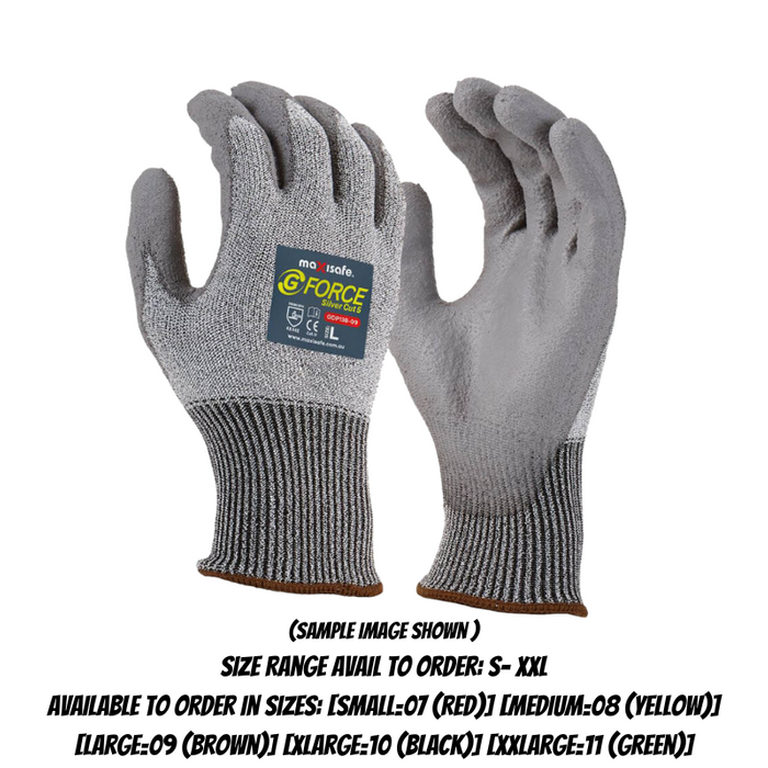 DESCRIPTION: G-Force Silver Cut E Glove. Available in sizes Small to 2XLarge. Grey 13 gauge HDPAI Super Cut Resistant Yarn. Excellent cut resistance with liner providing ISO level E performance. Touch screen compatible for use on most screens, tablets and mobile phones. Grey PU coated palm provides excellent grip and dexterity in dry or slightly wet conditions. HDPAI Yarn offers excellent breathability and sweat absorption. EN388:2003 level: 4544. Coloured Hem for Size identification. | Available to order in Sizes: [Small=07 (Red)] [Medium=08 (Yellow)] [Large=09 (Brown)] [XLarge=10 (Black)] [XXLarge=11 (Green)] | Bundle = 12 pairs (120 pairs per carton)