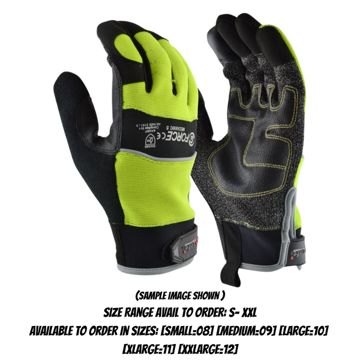 DESCRIPTION: G-Force Hi-Vis Cut F Mechanics Glove Hi-vis Yellow Glove with touchscreen fingertips. EN388:2016 rating of 4.X.4.4.F. 3mm EVA lined reinforced thumb crotch and palm. Clarino synthetic leather finger tips and thumb. Neoprene cuff with Velcro fastener. Hi-Vis Spandex back. Padded palm. Touchscreen compatible fingertips. Size Range Avail to Order: S- XXL l