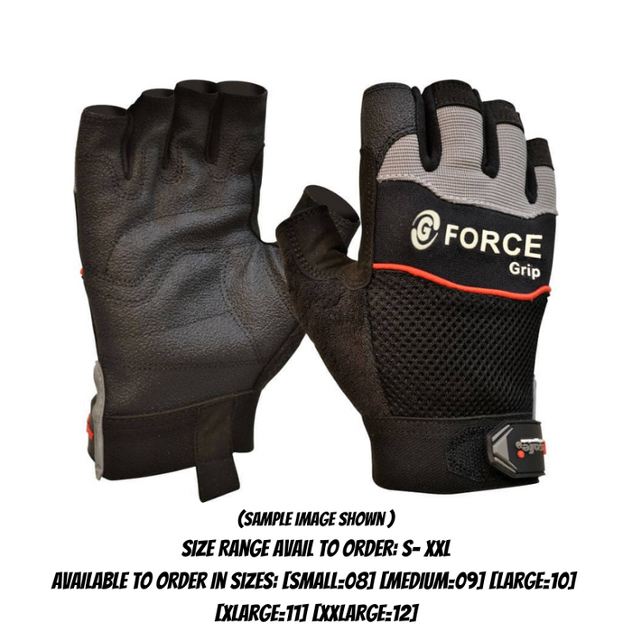 DESCRIPTION: G-Force 'Grip' Fingerless Mechanics Gloves. One piece synthetic leather construction with non-slip grip. Padded Reinforced Palms with terry cloth sweat patch. Velcro Wrist fastener and pull tab for pulling off. Fingerless for extra feel and ventilation. Ventilated fourchettes. Neoprene Knuckle Bar for comfort. Now with Cut Level 2 according to EN388!. Certified to EN388:2016 - 3 2 3 1 C | Size Range Avail to Order: S- XXL.
