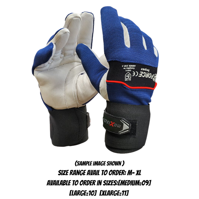 DESCRIPTION: G-Force Impax Anti-vibration Mechanics Glove with leather palm. Premium A grade leather. Gel padded wrist support. Gel padded palm and fingers. Flexible neoprene breathable back. Reinforced thumb crutch. Velcro wrist fastener. Cut Level D - according to EN388:2016. Available in sizes Medium (09), Large (10), XLarge (11). Certified to EN388:2016 - 3 3 4 3 D [Bundle= 6 pairs]