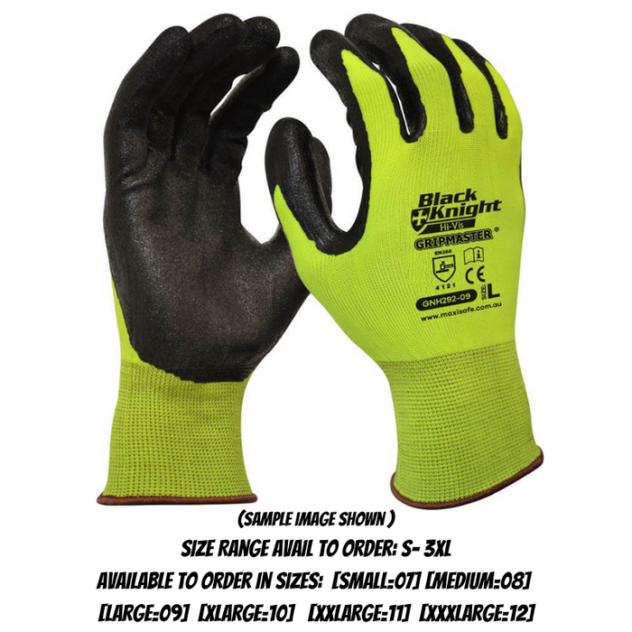 DESCRIPTION: Black Knight Gripmaster Hi-Vis Glove. Maxisafes Black GripmasterĀ® coating technology ensures the Black Knight has excellent grip in wet, oily environments. Multi-layered Gripmaster technology prevents oil penetration while repelling water ensuring excellent grip. Anti-Bac antimicrobial treatment provides protection against harmful bacteria and an anti-odour barrier. Touch screen compatible for use on most screens, tablets and mobile phones. 13 gauge lycra/nylon shell provides stretch for a close fit and breathability. No strikethrough to the inside of the glove to cause irritation or heat build up. Machine washable increasing glove life without reducing effectiveness of Anti-Bac treatment. Thin Gripmaster Coating ensures superior flexibility and dexterity. EN388 - 4121. HiVis for safety. Available to order in Sizes: [Small=07] [Medium=08]