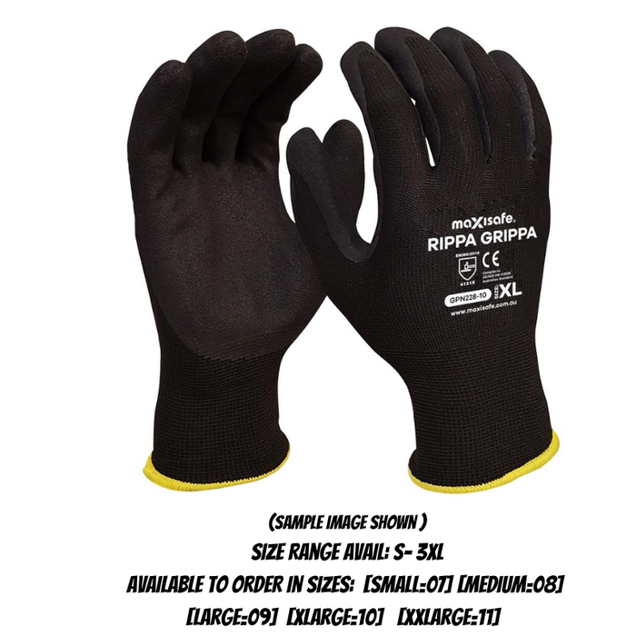DESCRIPTION: 'Rippa Grippa' Black Nitrile Coated Synthetic Glove. Sandy nitrile coated palm for excellent grip. 13G seamless shell for comfort. Touch screen compatible for use on most screens, tablets and mobile phones. Available in sizes small to 2XLarge. EN388:2016 4.1.2.1. | Pack =12 pairs / Carton = 120 pairs | Available to order in Sizes: [Small=07] [Medium=08]