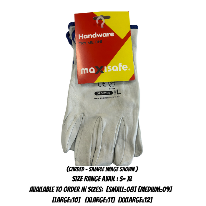 Product Features: Maxisafe Economy Full Grain Rigger Glove *CARDED* Genuine full grain leather, Wing thumb for stitch free palm, Double stitched for strength, Elastic wrist to prevent debris entering, Colour coded cuff for size identification (YELLOW), Manufactured to EN420 standard for accurate sizing and Certified to: EN388:2016 3.1.2.2.X. Applications: General purpose utility work glove, Truck and transport industry, Rigging and Lifting Industry, Timber and forestry, Oil and Gas Industry, Farm and agriculture applications, Mining and construction industries, Building industry and Civil construction. (Sold as each / Available in packs of 12 / 120 pair/carton) Available to order in Sizes: [Small=08] [Medium=09]