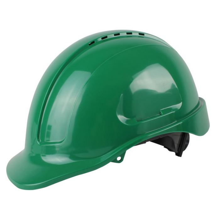 DESCRIPTION: Maxisafe Vented Hard Hat - Ratchet Harness. The Maxisafe Vented Hard Hat provides head protection that conforms to Australian Safety Standards. A full range of PPE accessories are also available to compliment the helmets including earmuffs, face shields, chinstraps, sweatbands and logo printing. FEATURES: AS/NZS 1801:1997 BSI Group Certified BMP 740955. Lockable single hand ratchet adjustment for easy, secure fitting. 6 point webbed harness & cradle system. 10 ventilation points for increased airflow. Lightweight, streamlined design. UV and impact resistant ABS material. Attachment slot fits most brands of earmuffs. Replaceable sweatband for user comfort. Expiry: 3 years from the date of first use (2 years for harnesses) AVAIL TO ORDER IN VARIOUS COLOURS: [Blue -B] [Fluro Yellow - FY] [Dark Green -G] [Orange -O] [Pink -P] [Red -R] [White -W] [Yellow -Y]