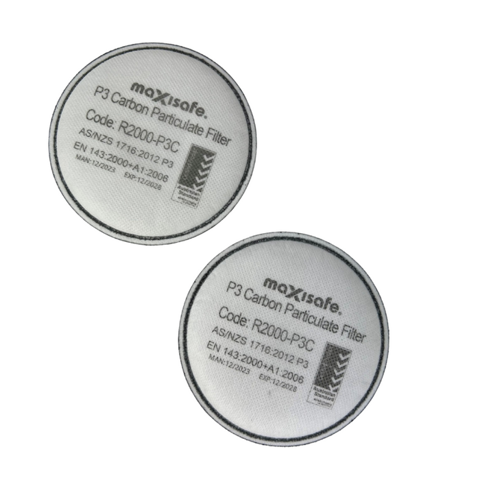 DESCRIPTION: P3 Carbon Particulate Filter. FEATURES: Certified to AS/NZS 1716. Certified to EN143:2000 P3 Carbon Particulate Filter. Lightweight and provides low breathing resistance. Suitable for us with MaxiGuard R7500 Half Face Respirators & R690 Full Face Respirators. Use this filter for protection against toxic dust, lead, asbestos and organic vapors, welding fumes and polishing and grinding particles. [Packaged: 1 pair of filters / 30 pairs per carton]. Expiry: 5 years from date of manufacture