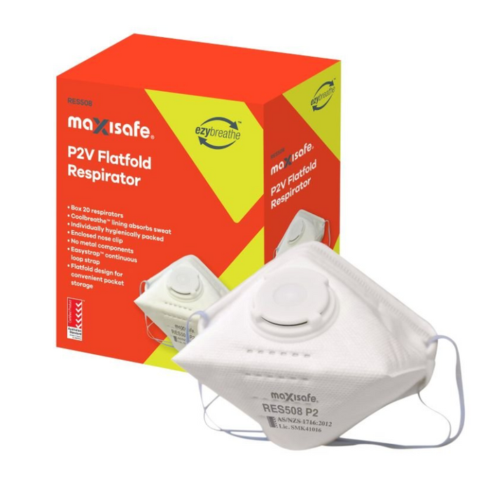 DESCRIPTION: P2 Flat Fold Respirator with Valve - box 20. FEATURES: Coolbreathe lining absorbs sweat. Individually hygienically packed. Enclosed nose clip. No metal components. Easystrap - continuous loop strap. Flatfold design for convenient pocket storage. Certified to AS/NZS 1716. Box of 20 Masks (Cartons of 12 boxes). Expiry: 3 years from date of manufacture.