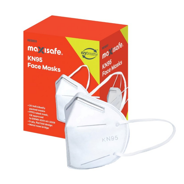 DESCRIPTION: KN95 Flatfold mask with earloops FEATURES: Worn over the nose and mouth to minimise the chance of inhaling airborne particles like viruses and other germs. CE approved to EN149-2001+A1-2009. Bacteria and dust filtration efficiency >95%. 5-ply, flat fold design for easy storage in pockets etc. Elastic ear-loop, non-medical mask. Metal nose bridge for comfortable fit. 20 Individually packed masks per box. Expiry: 3 years from date of manufacture