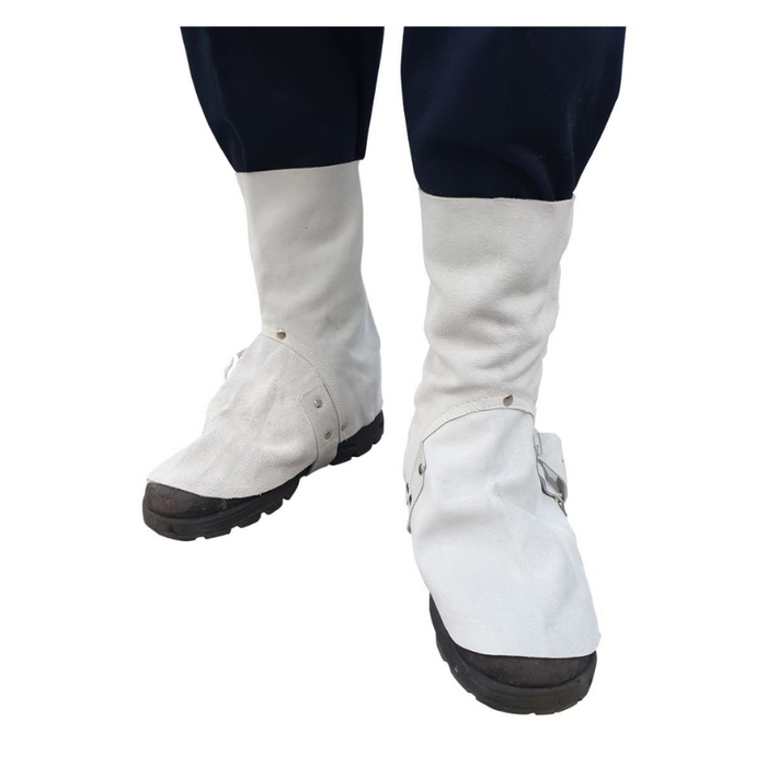 DESCRIPTION: Welders Spats. Made from selected chrome split leather. Fitted with under-shoe leather strap and buckle closure. Rear Velcro allows for adjustment. Full boot coverage. Sewn with Kevlar thread. One size fits all