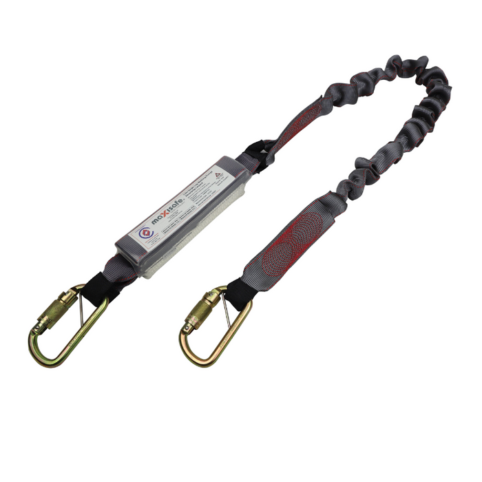 DESCRIPTION: Maxisafe 2M Heavy Duty Web Shock Absorbing Lanyard with Triple Action Karabiners. FEATURES: Shock absorber at harness end provides maximum force on user in the event of a fall 6kN. Elasticated 44mm high strength tubular polyester webbing provides shorter relaxed length while moving around. Abrasion resistant cover on loop ends to prevent damage from snap hook. Triple Action Karabiners provide highest level of connection. Meets and Tested to AS1891.5:2020 Certified by BSI. Expiry: 10 Years from date of manufacture. Capacity: One person plus tools ~ 60-140kg