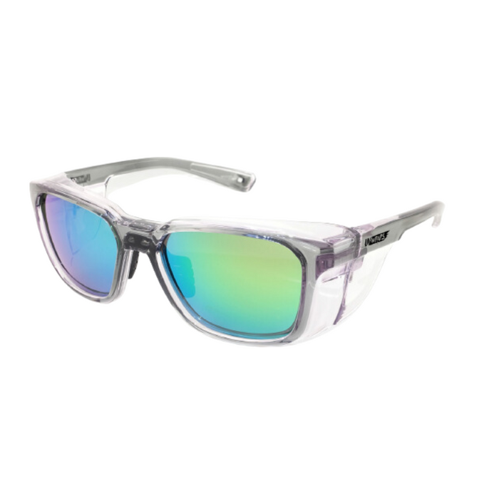 DESCRIPTION: Polarised Green Mirror Lens - Safety Sunglasses. Shatterproof PC Polarised Green Mirror Lens, Clear Side shields for Enhanced Peripheral Vision, Fully certified to AS/NZS 1337.1:2010, Category 3 Sunglass Rating, Scratch Resistant, Anti Fog [Carton QTY of 12]