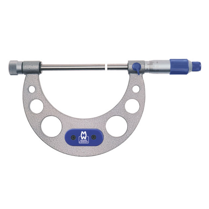 DESCRIPTION: Micrometer with Interchangable Anvils 0-100m. Range 0-100mm. Resolution 0.01mm [Moore & Wright] FEATURES & BENEFITS: Features wide measuring range with interchangeable anvils. Hardened and ground spindles/anvils. Strong forged steel frame, hammertone finish, insulated grip. Satin chrome scale. Tapered for easier access to difficult areas. With tungsten carbide measuring faces and constant force ratchet. Packed in wooden box with standard and adjusting key.