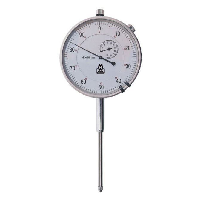 DESCRIPTION: Dial Indicator 0-50mm. Range 0-50mm. Resolution 0.01mm. Diameter 58mm/flat [Moore & Wright] FEATURES & BENEFITS: Satin chromed body. With tungsten carbide measuring tip. With double dial indicator for measuring mm stroke. Adjustable scale with stop screw. Stem Mounting.