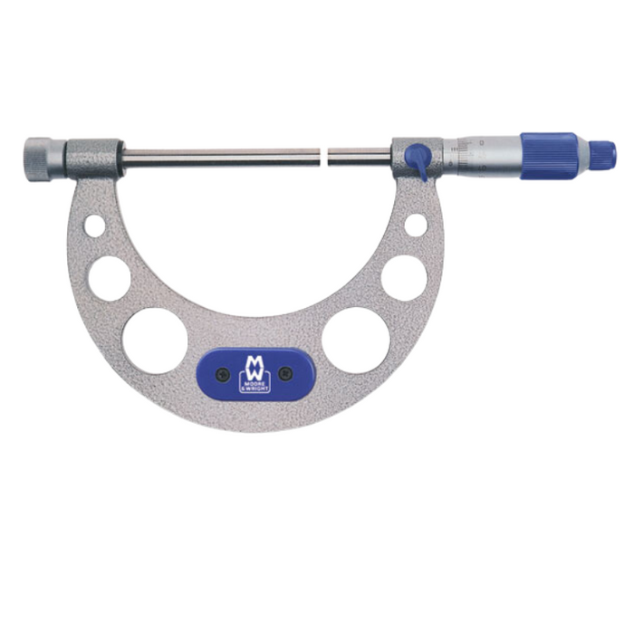 DESCRIPTION: Micrometer with Interchangeable Anvils 0-150mm. Range 0-150mm. Resolution 0.01mm. [M&W MICROMETERS] FEATURES & BENEFITS: Features wide measuring range with interchangeable anvils. Hardened and ground spindles/anvils. Strong forged steel frame, hammertone finish, insulated grip. Satin chrome scale. Tapered for easier access to difficult areas. With tungsten carbide measuring faces and constant force ratchet. Packed in wooden box with standard and adjusting key.