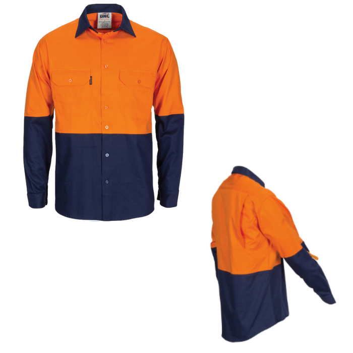 DESCRIPTION: 3733 HiVis L/W Cool-Breeze T2 Vertical Vented Cotton Shirt with Gusset Sleeves - Long Sleeve.155 gsm lightweight cotton. Twin button down flap chest pockets, two tone front & back. Under arm & type 2 (part-mesh) vertical back cotton mesh vents. Gusset Sleeve. AVAIL COLORS: Yellow/Navy or Orange/Navy AVAIL SIZES:XS-6XL FEATURES: SUN Protection UPF 40+ - 50+ DNC garments are tested for UPF (ultraviolet protection factor) in accordance with AS/NZS4399:1996. The level of protection varies depending on the fabric and colour of the garment. 15+ good protection, 30+ / 35+ very good protection, 40+ / 50+ excellent protection. 100% Cotton DNC has an extensive 100% cotton range for a natural feeling garment with anti-static and electrical protection features. COOL- BREEZE Airflow Vents DNC Cool-Breeze airflow cooling system removes sweat and body heat through innovative under-arm vents, upper back or vertical vents. Anti-static The latest technology is used in the production of DNC carbon grid anti-static jacket and pants, complies BS5958.2-1991. DNC cotton garments containing no metal buttons or zippers are also classified under DNC anti-static. Electrical Protection DNC cotton made garments containing no metal buttons or zippers and are suitable for use in electrical or gas trades. Environmentally Friendly Green Dye Oeko-Tex Standard 100 Safe to wear against the skin All DNC garments use the Green Dye only, except for the Patrol Saint Flame Retardant range. All DNC garment fabric fully complies with Oeko-Tex standard 100 class II for products with direct contact to the skin in which prohibited to use aromatic amines, sensitizing dyes and cancer risk dyes. Green dye should meet the following conditions: Does not contain harmful or non-aromatic amine; dye itself, non-carcinogenic, sensitization, acute toxicity; the use of formaldehyde and, after extraction of heavy metals in the following limits; non-environmental hormone; non persistent organic pollutants; does not produce pollution of the environment harmful chemicals; not produce chemicals that pollute the environment; colour fastness and superior to disable the use of dyes. HiVis Day Fabric & Design New AS/NZS 4602.1:2011 DNC HiVis garments are manufactured to comply with New Hi Vis standard Class F AS/NZS1906.4:2010, Class D AS/NZS 4602.1:2011 to meet the requirements of Hi-Vis safety standards for both HiVis Fabric & Design of garments, (Section 6.4) day use.