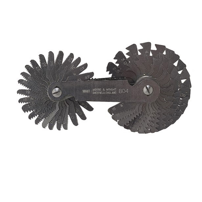 DECRIPTION: Metric & Imperial Screw Pitch Gauge [Moore & Wright ] Combined SI Metric and Whitworth | Number of Blades 49 | Thread per mm | METRIC 0.4, 0.5, 0.7, 0.75, 0.8, 0.9, 1.0 1.25, 1.50, 1.75, 2.0, 2.5, 3.0, 3.5, 4.0, 4.5, 5.0, 5.5, 6.0, 6.5, 7.0 | IMPERIAL 4, 4.5, 5, 6, 7, 8, 9, 10, 11, 12, 13, 14, 16, 18, 19, 20, 22, 24, 25, 26, 28, 30, 32, 36, 40, 48, 60 FETURES & BENEFITS: Accurately milled steel blades. Designed to check both internal and external thread forms. Marked with nominal size on each blade. All blades fixed in a steel sleeve. Screw cutting gauge included - 60 Degrees.