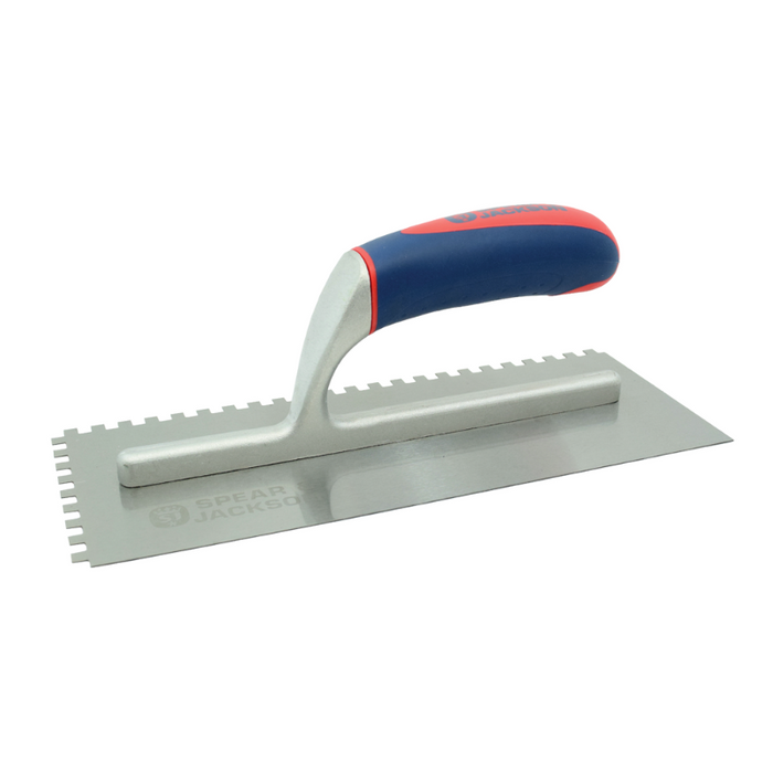 DESCRIPTION: Notched Float 6mm | Blade Size 280mm x 113mm | Notch Size 6mm. FEATURES: Carbon Steel Blade. Aluminium Tang. Ergonomic Soft Grip Handle.