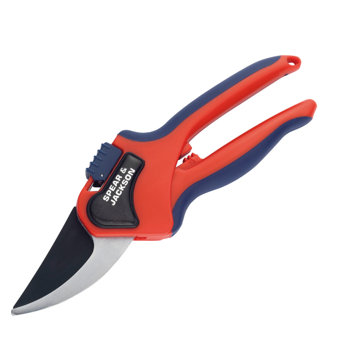 DESCRIPTION: Razorsharp Advantage Large Bypass Secateurs. Max Cutting Capacity 20mm. FEATURES: Large Handle Suitable for Larger Hands. SK5 Carbon Steel Blades. Bi-Material Non-Slip Comfort Grips. PTFE Coated Blades for Rust Resistance & Smooth Cutting. Drop Nose Blades for Easier Pruning. Contoured Ergonomic Handles. Ambidextrous Locking Catch. Sap Groove in Blade. Shock Absorber. Stem Crusher.