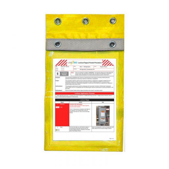 DESCRIPTION: Document/Permit Holder - Yellow FEATURES: Weatherproof holder to protect your documents outdoors or in harsh environments. Use these permit holders to protect important documents around your facility and in outdoor environments. Measures 270mm (W) x 460mm (H). Features reflective strap. Yellow - heavy duty with Velcro for quick, secure sealing. Eyelets to conveniently hang from machinery.