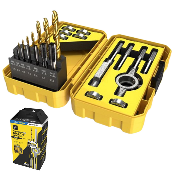 DESCRIPTION: 23 Piece | Alpha Drill,Tap and Die Metric M3-M12 Tuffbox Pro Set | Bonus 120ml Lubricant || SET CONTAINS: Carbon Xtra Hand Taps - Metric Intermediate: M3 x 0.5, M4 x 0.7, M5 x 0.8, M6 x 1.0, M8 x 1.25, M10 x 1.5, M12 x 1.75. || Button Dies Metric Coarse: M3 x 0.5, M4 x 0.7, M5 x 0.8, M6 x 1.0, M8 x 1.25, M10 x 1.5, M12 x 1.75 || GOLD Series Drills - Metric Tapping: 2.5, 3.3, 4.2, 5.0, 6.8, 8.5 and 10.2mm. || Tap Handle TW-O: M3 - M12 and Button Die Wrench - 1” BDW-1 FEATURES & BENEFITS: Carbon Xtra Hand Taps: Ideal for: Steel, aluminium, copper & brass. Manufactured from premium European raw material. With a unique composition including high levels of Chronium, Vanadium & Nickel. Precision hardened to 60HRC producing a tap that significantly outlasts & outperforms standard carbon taps || Alpha Gold Series Drills: Ideal for: steel, wood, plastic & stainless steel. Suits: Power drill and pedestal drill. 135-degree split point cuts faster & reduces wandering. Titanium nitride coating reduces heat & increases lubricity for extended life. Fully ground M2 HSS raw material for extended life.