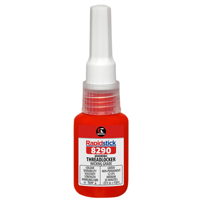 DESCRIPTION: Rapidstick™ 8290 Threadlocker Green 10ml SPECIFICATIONS: Rapidstick™ 8290 Threadlocker is a fast curing, medium strength compound, which penetrates threads by capillary action. It is ideal for sealing hairline cracks, small nuts and bolts, and securing setscrews and other assemblies after settings are completed.8290 has high resistance to heat, vibrations, water, gases, oils, hydrocarbons, and many chemicals. It seals and welds porous metal parts, and prevents corrosion and leakage. Localised heating and hand tools are needed for disassembly. 8290 performs best in thin bond gap. It bonds and seals fasteners on vibrating machines or moving components, and is specifically formulated to give controlled friction and torque/tension ratio during assembly. It can also be used for the retaining of cylindrical parts. 8290 meets Military Specifications: MIL-S-46163A Type III, Grade R & MIL-S-22473E Letter Grade AA | Colour: Green | Permanent: No | Viscosity: 12 cps | Handling Cure Time: 20 minutes | Strength: Medium | Temperature Range (°C): -55 to +150 | Gap Filling: Up to 6mm (1/4?)