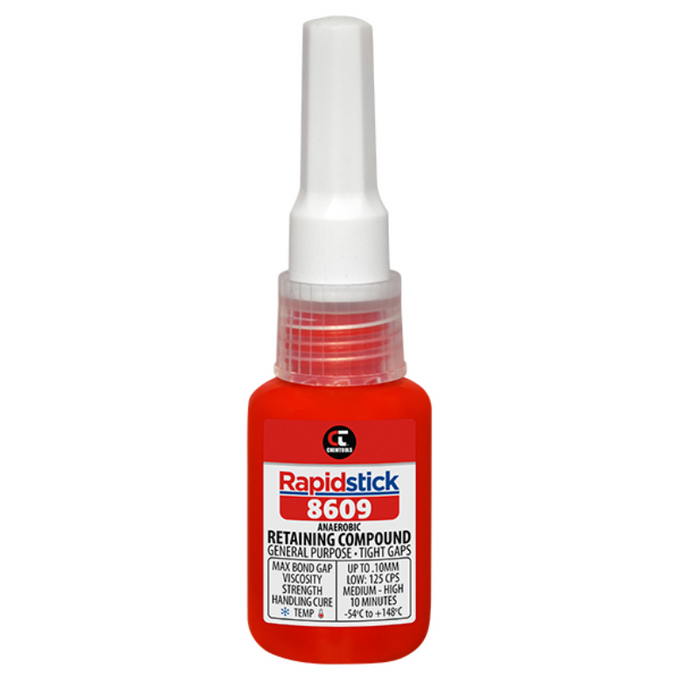DESCRIPTION: Rapidstick™ 8609 Retaining Compound - Green 10ml SPECIFICATIONS: Rapidstick™ 8609 Retaining Compound is a green, fast curing, low viscosity compound, ideal for close fitting parts, bushes, pulleys, and gears. As a general purpose ‘go to’ retaining compound, it also offers excellent sealing and thread locking properties, and is typically used to join rotor to shafts in fractional and sub-fractional horsepower motors. 8609 meets Military Specification MIL-R-46082B, Type I. | Colour: Green | Max Bond Gap: 0.10mm | Viscosity: Low (125 cps) | Consistency: Liquid | Strength: Medium to High | Handling Cure Time: 10 mins | Cure Speed: Fast | Temperature Range (°C): -54 to +148