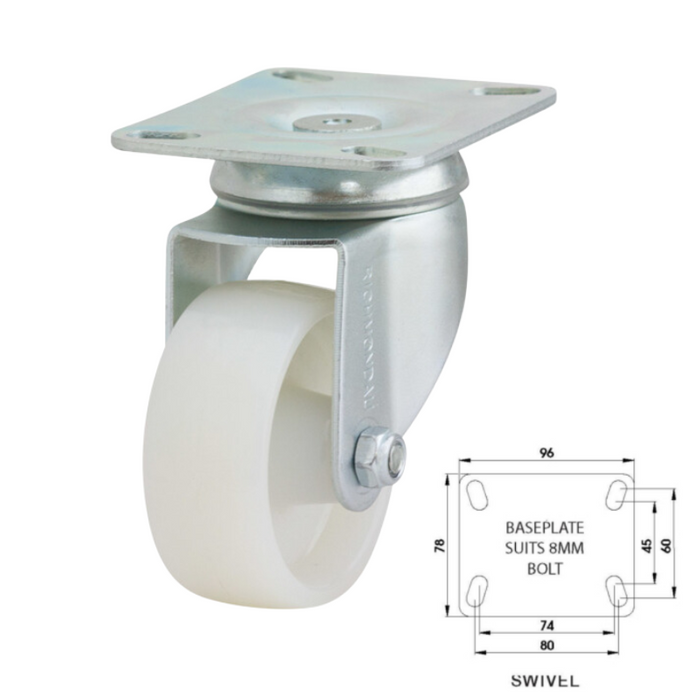 DESCRIPTION: 75mm Nylon Swivel Zinc Durolite Castor | Wheel Diameter (mm): 75 | Frame Type: Swivel | Wheel Width (mm): 30 | Wheel Type: Nylon| [Replacement Wheel Code: NY3323] | Wheel Bearing Type: Plain Bore | Castor Height (mm): 107 | Swivel Radius (mm): 71 | Maximum Load Capacity (kg): 100