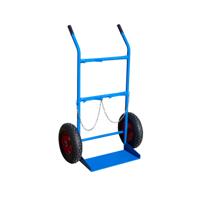 DESCRIPTION: Gas Bottle Trolley with Puncture Proof Wheels (GBR003) | Holds up to 2 x G Size Gas Cylinders | Wheel Type: Puncture Proof | Trolley Size (mm): 800 x 1350 | Toe Plate Size (mm): 250 x 580 | Wheel Diameter (mm): 405 | Maximum Load Capacity (kg): 200