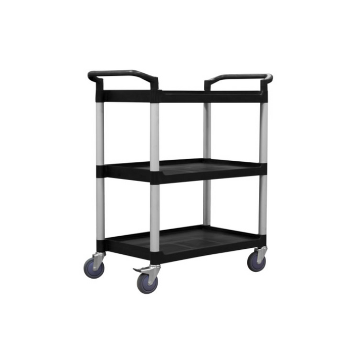 DESCRIPTION: 3 Tier 625x430 Service Trolley (STR322) | Colour Black | No of Tiers: 3 | Capacity (kg): 60kg per shelf (180kg total) | Platform Size (mm): 625 x 430 | Top Shelf Height (mm): 850 | Handle Height (mm): 950 | Wheel Size (mm): 100