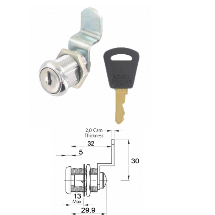 DESCRIPTION: Cam Lock 32mm | Chrome Finish | Bent Cam | Key Lockable | Keyed Alike (1 Key Included) | 32mm Maximum Grip | 13mm Maximum Panel Thickness | 1 Way Locking