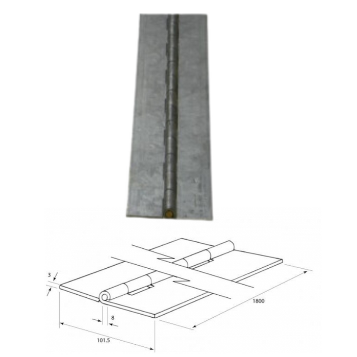 DESCRIPTION: Piano Hinge - Old Style Commercial Piano Hinges | 101.5 x 3 x 8 x 1800mm | Open ( A): 101.5 | Gauge (B): 3.0 | Pin Dia (C): 8.0 | Pin Material: Mild Steel | Length ( D): 1800 | Material: Mild Steel
