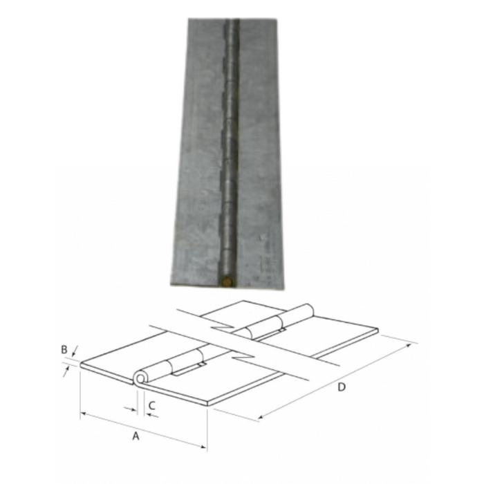 DESCRIPTION: Piano Hinge - Old Style Commercial Piano Hinges 38 X 1.5 X 5 X 2440mm | Open(A): 38 | Guage(B): 1.5 | Pin Dia(C): 5.0 | Pin Material: S/S 304 | Length(D): 2440 | Material: S/S304