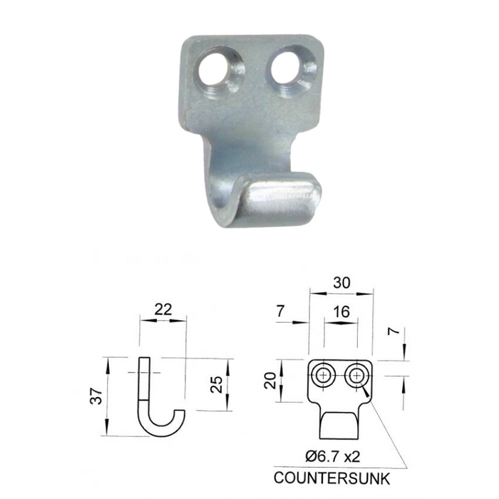 DESCRIPTION: OL6263 in-line hook plate | Heavy duty design | Two mount holes | Countersunk holes for flush mount when used with countersunk bolts or screws | Standard in-line hook | Zinc plated