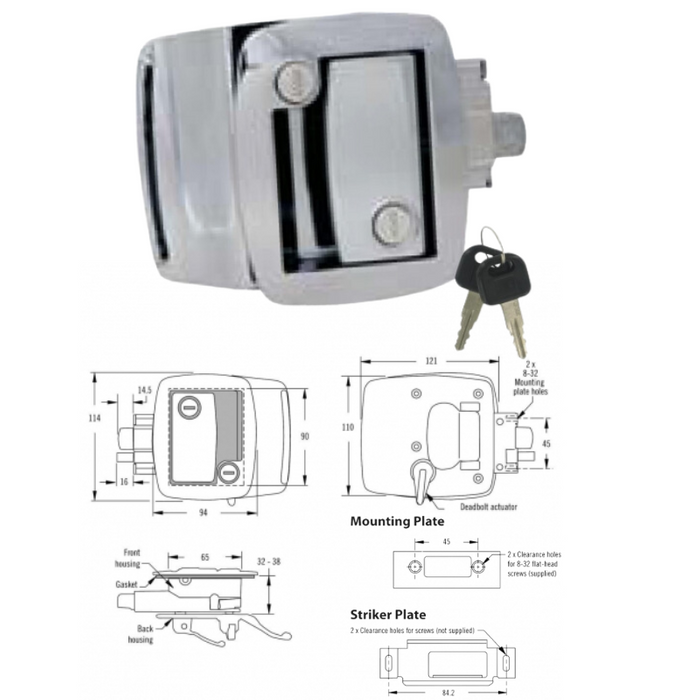 DESCRIPTION: R3 Push-To-Close Latch | Polished Chrome | Pull To Open | Environmentally sealed | Dual sided access and locking | Notes: Mounting plate, striker plate and all mounting screws except striker plate screws are provided with each lock set.