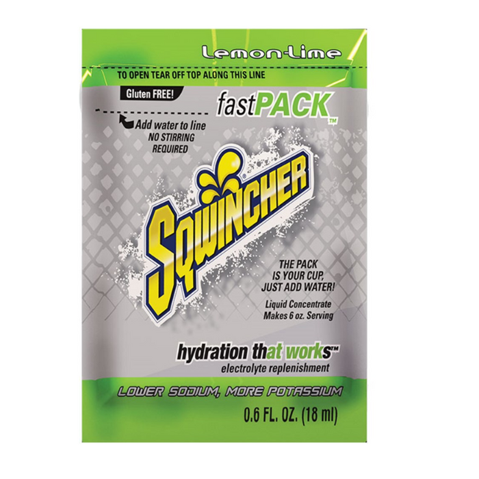 DESCRIPTION: Sqwincher Fast Pack - 180mL - Sqwincher's electrolyte fast pack is an easy to use on-the-go electrolyte enhanced beverage. Simply tear off the top of the packet and enjoy your drink straight from the pack. FEATURES: Regular Sqwincher | Drink straight from pack by filling it with water to the indicated line on the pack | Fits in your pockets for an on-the-go drink | Convenient single serve packaging for portion control | Low Sodium, caffeine-free, gluten free | Great taste for increased fluid consumption | Each pack makes 180ml of Sqwincher [ Also Avail to order in flavours: Lemon-Lime/ Orange / Tropical / Wild Berry