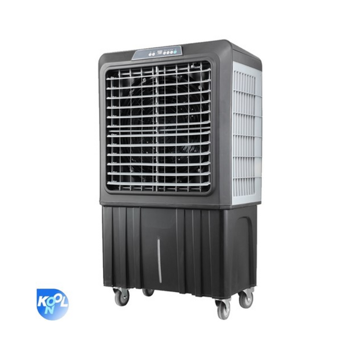 DESCRIPTION: INDUSTRIAL 420 WATT MOTOR 3 SPEED 100L TANK 12,000 CU/M | Depth: 520mm | Width: 780mm | Height: 1,350mm | Weight: 42kg | Water Tank: 100L | Kool-On portable evaporative air conditioner for workshops and sheds. Use this portable 240v cooler in your workshop to keep cool this summer. Featuring castors for portability, 3 speed fan and auto-swing settings to cool a wide area. It will hold 100 litres of water and can be attached to a hose for automatic fill. Has a remote control and a separate container to hold ice to keep the water as cool as possible. FEATURES: Fitted with lockable castors for portability | Selectable 3 speed 240v 420 watt motor | Auto swing | Automatic water shortage protection | Large 100 Litre water tank capacity | Automatice fill/float option - connect to a hose outlet | Airflow 12,000 Cu/M per hour | Ice container section to reduce water temperature | Convenient remote control