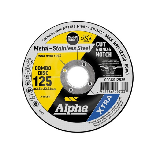 DESCRIPTION: ALPHA Cutting Disc Cut, Grind & Notch Combo 125 x 3.5mm Stainless XTRA