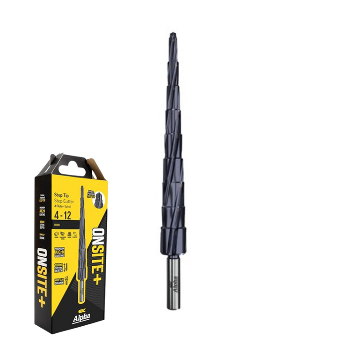 DESCRIPTION: Alpha Onsite Plus Step Tip Step Cutter | 4-12mm | 9 Steps: 4.0, 5.0, 6.0, 7.0, 8.0, 9.0, 10.0, 11.0 & 12.0mm FEATURES: 10mm Cutting Depth. Patented step tip design eliminates pre-drilling. AlCrN coated for extreme temperature resistance & long service life. 4 High-performance cutting edges help drill 6x faster. 3-Flat shank prevents spinning & ensures optimal power transmission. Suits: Power Drills. Ideal for steel, wood, plastic & stainless steel.