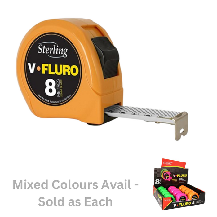 DESCRIPTION: 8m x 25mm V-Force Fluro Measuring Tape | Clear Graduated Markings | Hi-Vis Colours to locate quicker in a toolbox | Compact system with a smooth rolling action | Fully incremented markings on blade to help prevent 100mm mistakes | White 25mm nylon coated blade with matte finish to help prevent reflection