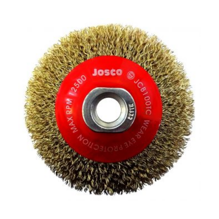 The Josco 100mm Brass Coated Tyre Cord Steel Crimped Bevel Brush is specifically designed for brushing hard-to-reach work piece areas. The bevel design allows the brush to be operated either as a flat brush or a wheel brush.