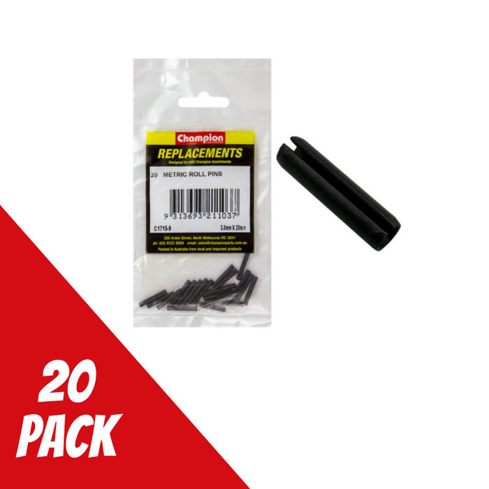 DESCRIPTION: Champion ROLL PINS-3.0 x 20mm Pkt = 20 Black Oxide