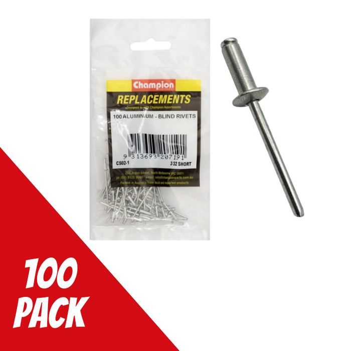 DESCRIPTION: Champion RIVETS-BLIND-ALUMINIUM-2.4 x 7.37mm Pkt=100