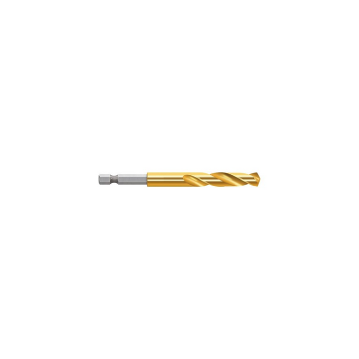 DESCRIPTION: 9.5mm Hex Shank Quick Release Drill Bit - Gold Series FEATURES: 30% More Holes* | Suitable for IMPACT DRIVERS & CORDLESS DRILLS | 1/4 QUICK CHANGE | Titanium nitride coating reduces heat & increases lubricity for extended life | 135° Split Point cuts faster & reduces wandering
