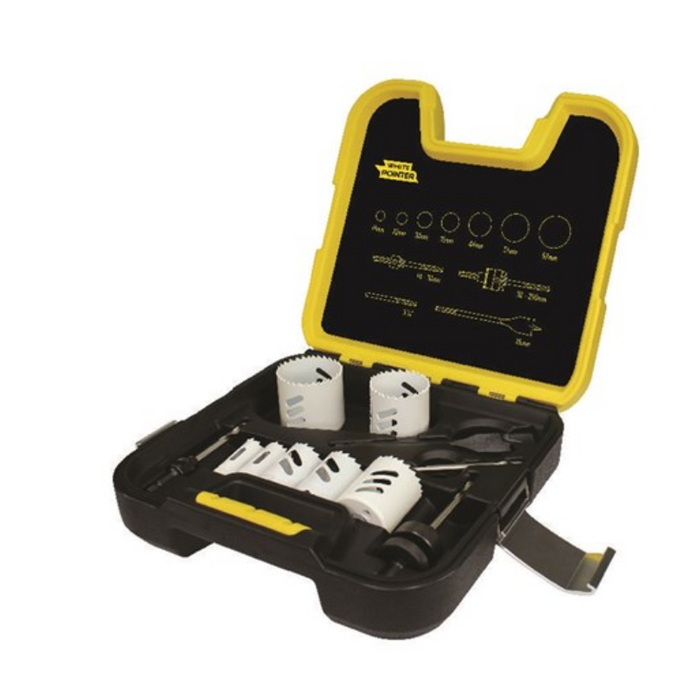 DESCRIPTION: Plumbers 11 Piece: White Pointer Holesaw Kit INCLUDES: 7 x Holesaws: 19, 22, 30, 35, 44, 51 & 57mm Spade Bit (TurboBORE): 16mm + Small arbor with pilot drill: Suits 14 – 30mm holesaws + Large arbor with pilot drill: Suits 32 – 250mm holesaws + Pilot drill: 31/4 + Adaptor FEATURES: White Pointer Bi-Metal Holesaws - 11 PCE PLUMBER'S Kit | Variable tooth unique variable tooth geometry for consistent cutting ability in a wide range of materials | Manufactured to strict Alpha specifications to suit demanding Australian conditions | 8% cobalt Bi-metal gives ultimate performance and superior welding technology prevents tooth strippage | 38mm cutting depth