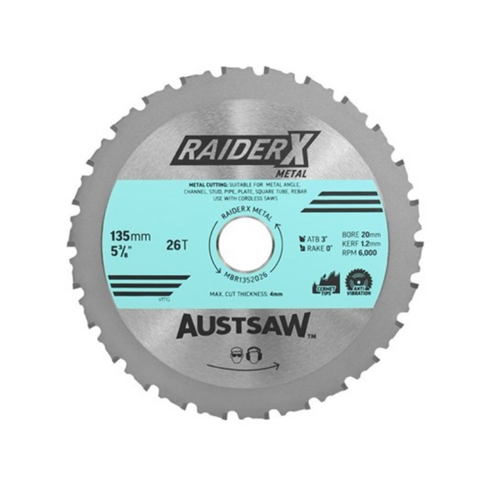 DESCRIPTION: Austsaw RaiderX Metal Blade 135mm x 20 x 26T FEATURES: RAIDERX Metal blades exhibit maximum performance in metal cutting applications. Featuring cermet tips this blade has 3x the life of its competitors. |Premium cemented carbide tips give exceptional life and clean, cool cutting in metal | Blade designed with laser cut slits for noise reduction | Super thin kerf design delivers a smooth and sharp cut | Advanced tooth geometry improves balance and stability in a straight running cut
