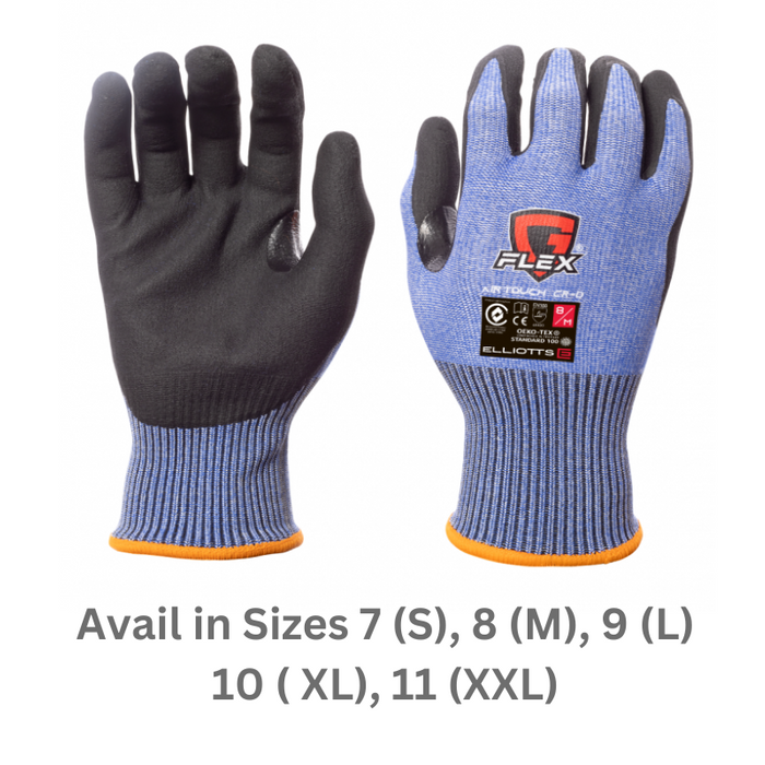 DESCRIPTION: G-Flex® AirTouch Cut-D Cut Resistant Glove FEATURES: Dynamax® 15D 15-gauge seamless blue liner • TDM Cut Level D protection • Reinforced thumb crutch for improved durability • Instant touchscreen capabilities • ‘Finger Dip’ technology providing ventilation to back of hand • Provides highest levels of abrasion and tear resistance • Extremely comfortable with excellent dexterity, sensitivity and tactility • Excellent grip on most surfaces including those with light oil • Oeko-Tex® tested materials STANDARDS: Certified by BSI to AS/NZS 2161.3:2020 (EN388) Occupational protective gloves - Protection against mechanical risks. AVAIL TO ORDER IN SIZES: ELG3450size (sizes: 07-11) W/ Colour coded Cuffs: 7 - Small (Blue) | 8- Medium (Orange) | 9- Large ( White) | 10- XLarge (Yellow) | 11 - XXLarge (Brown) [Sold as Each | Bundles of 12 | Carton of 120