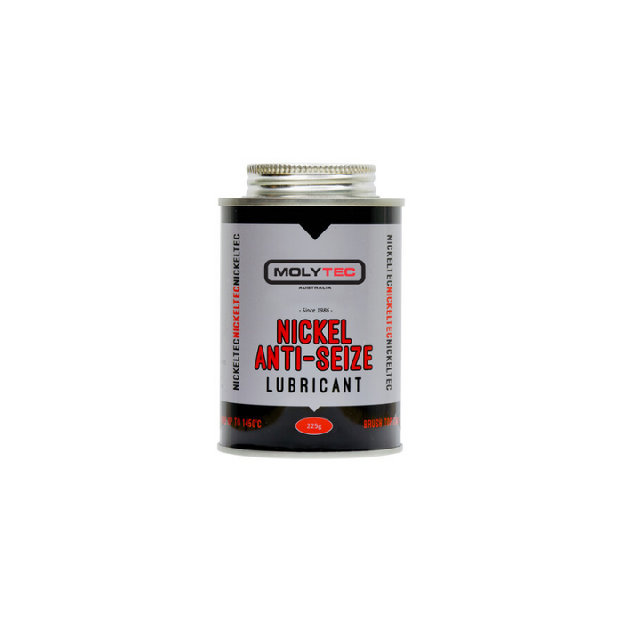 DESCRIPTION: Nickeltec Anti-Seize - 225g BTT - Nickel Based Anti-Seize Compound. Developed to Protect Parts from Corrosion, Galling and Seizing FEATURES: Molytec Nickeltec Anti-Seize is a nickel based anti-seize compound. Developed to protect metal parts from corrosion, galling and seizing. Nickeltec eases assembly & disassembly of slip fit and threaded joints. Formulated for severe environments, these products protect against high temperatures up to 1450c. DOES NOT CONTAIN GRAPHITE. High Temp Resistance - Formulated with high quality grease and solid lubricating agents for optimal temperature resistance up to 1450c. Seals Against Corrosion - Displaces and seals against contact with moisture and other corrosive liquids. Reduces Friction & Where - Reduces metal-to-metal contact resulting in less friction & wear. Extreme Chemical Resistance - Perfect for applications in chemical plants, oil refineries and water / sewage plants.