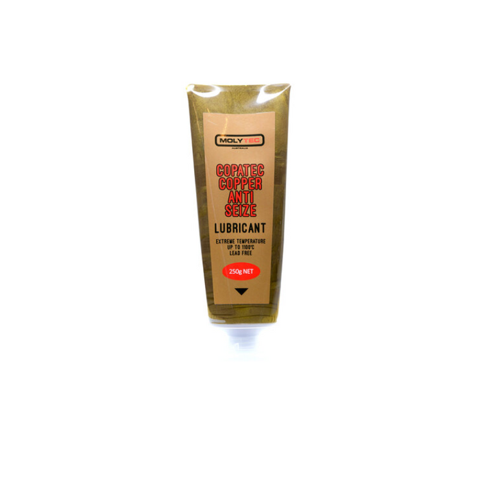 DESCRIPTION: Copatec Anti-Seize 225g Tube -Copper Based Anti-Seize Compound. Developed to Protect Parts from Corrosion, Galling and Seizing FEATURES: Molytec Copatec Anti-Seize is a copper based anti-seize compound. Developed to protect metal parts from corrosion, galling and seizing. Ideal for corrosive environments and extreme temperature conditions. Contains anti-oxidants, anti-corrosion inhibitors, copper and metallic particles in a bentone base. Resistant to Acid, Alkali, Seawater, Water and Steam. Remains effective at surface temperatures up to 1100c.
