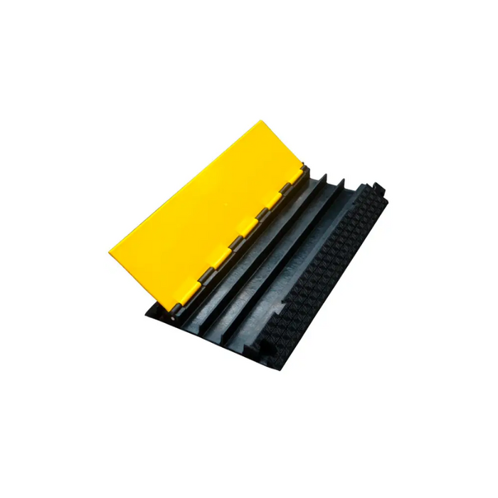 DESCRIPTION: Rubber Cable Protector (3 Channel) FEATURES: Protect cables and leads, and eliminate the risk of trips and falls from loose cabling. Non-conductive rubber construction will provide a safe passage for pedestrians and vehicles. Simple hinged lid operation - top opens to expose large channels. Easily suits a variety of cable and hose sizes, simply lay and position in place. Multiple units can be connected for required length. Recommended for temporary outdoor applications, light-duty vehicle or pedestrian traffic. Dimensions: Length 900mm x Width 430mm x Height 55mm Weight: 10.2kg Number of Channels: 3 Channel Size: 60(W) x 40(H)mm